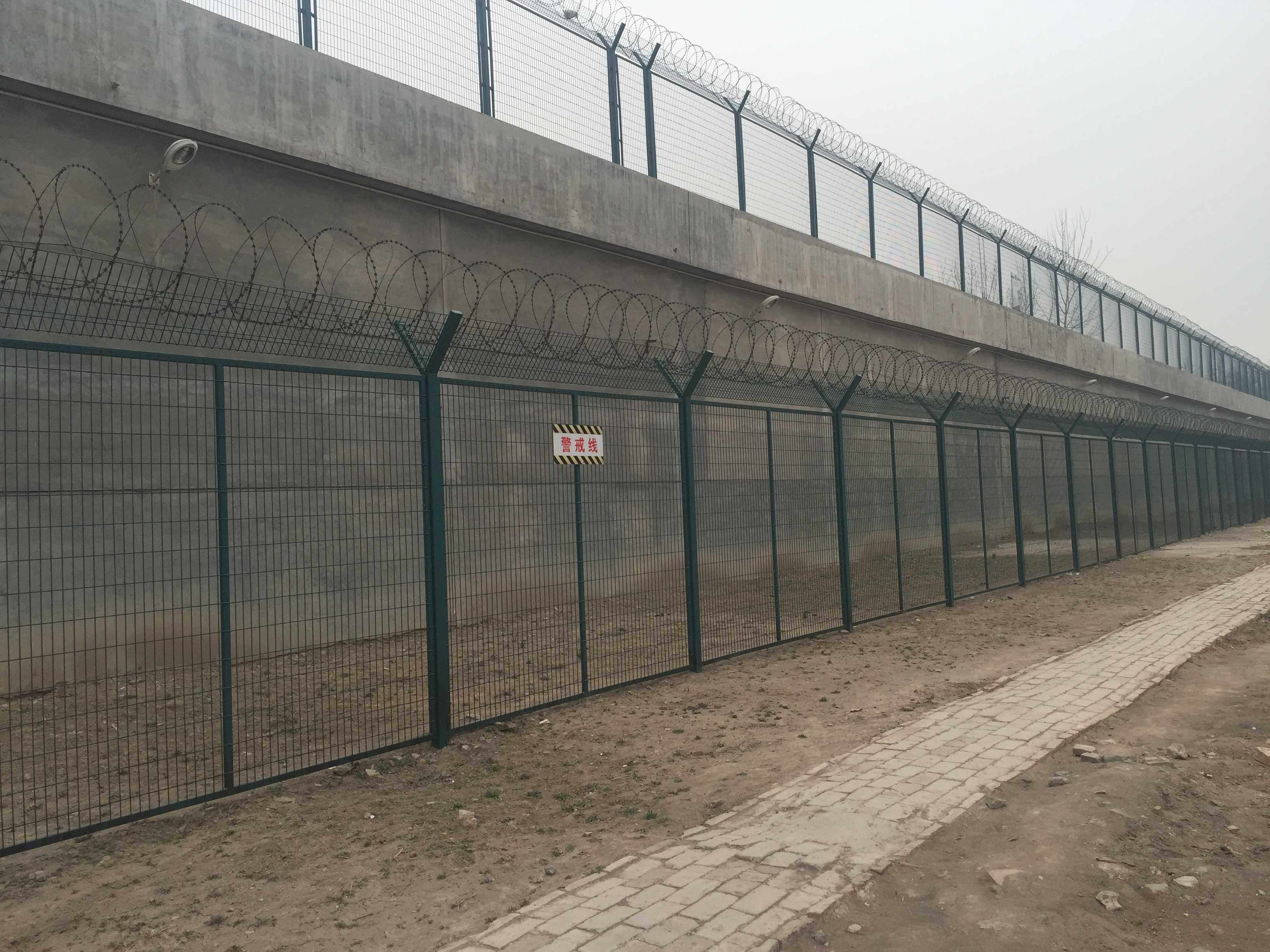 監(jiān)獄鋼絲焊接的網(wǎng)片采用低碳鋼絲焊接而成,表面采用pvc浸塑處理,與刀刺網(wǎng)連接。安裝刀刺網(wǎng)的立柱采用6CM*6CM方管,壁厚在2-2.5MM,高2.4米,底部2米圍直線,上部0.4米向內(nèi)折30度成斜線,立柱間隔為3米;橫梁采用4CM*2CM長方鋼,長3米為一個單位:立柱和橫梁表面涂黑綠色(注塑工藝),橫梁和立柱配有連接件。